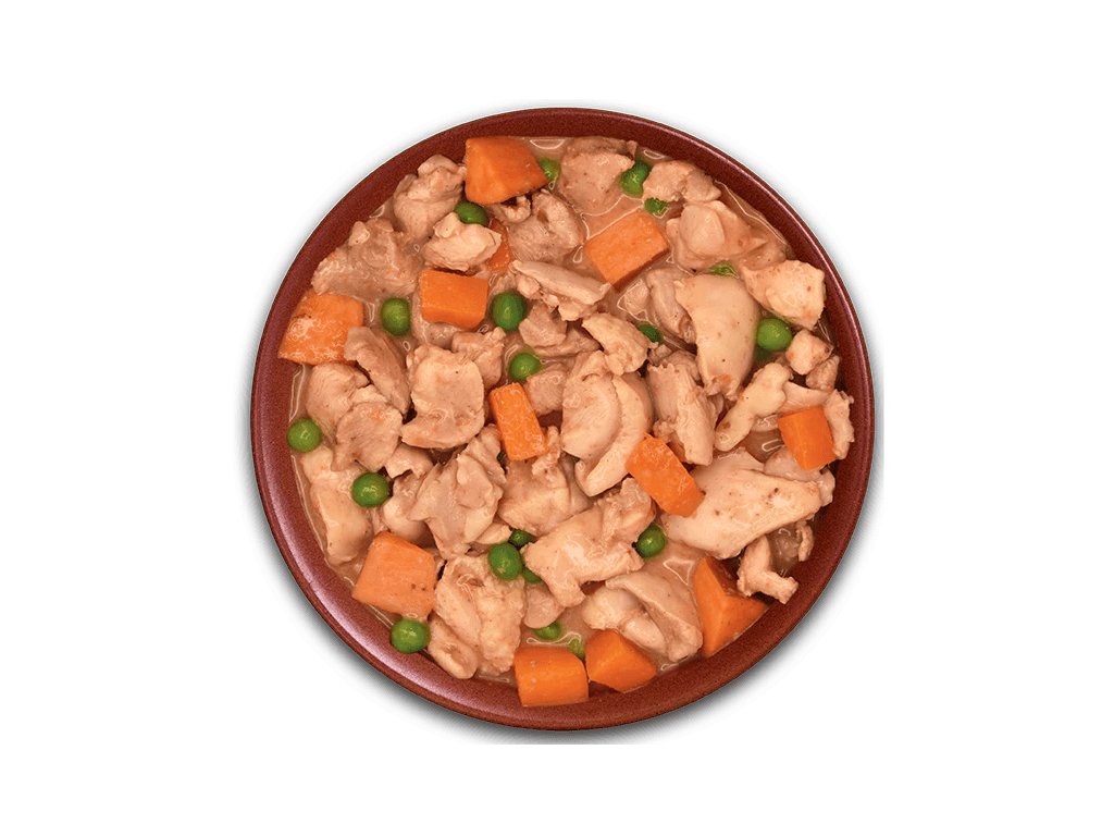 97% čerstvé kuřecí maso v omáčce, hrášek, mrkev, sladké brambory, koření.