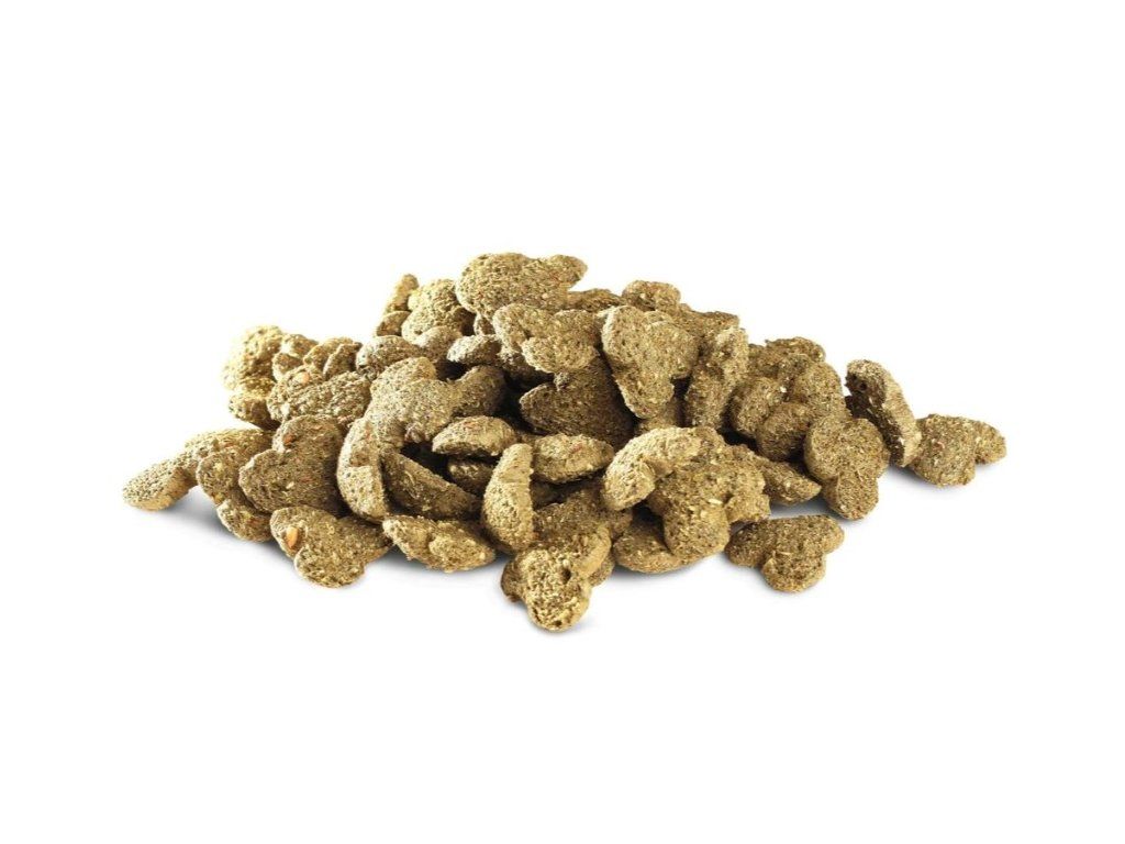 vojtěška, pšenice, ječmen, sušená jablka, byliny (kopřiva, pampeliška, jitrocel), pšeničné klíčky, šípky, lněné semínko, mannanoligosacharidy (75 mg/kg), fruktooligosacharidy (50 mg/kg), extrakt z juky schidigera (45 mg/kg)