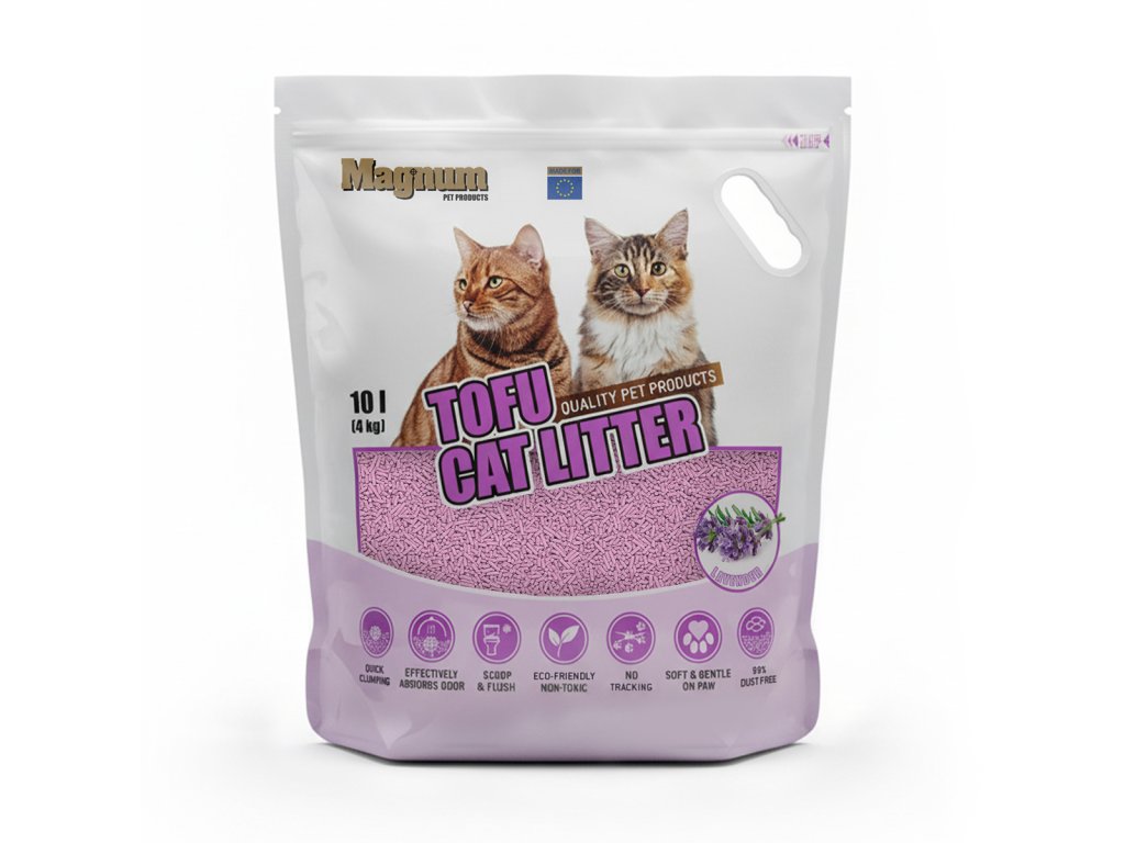 Ekologická podestýlka Magnum Tofu Lavender představuje moderní a udržitelnou alternativu k běžným stelivům. Vyrábí se ze sójové drti – vedlejšího produktu při výrobě tofu – a je tak šetrná nejen ke kočkám, ale i k přírodě. Díky přirozené vláknité struktuře rychle vytváří pevné hrudky, které se snadno odstraňují, čímž udržují toaletu čistou a bez zápachu.
